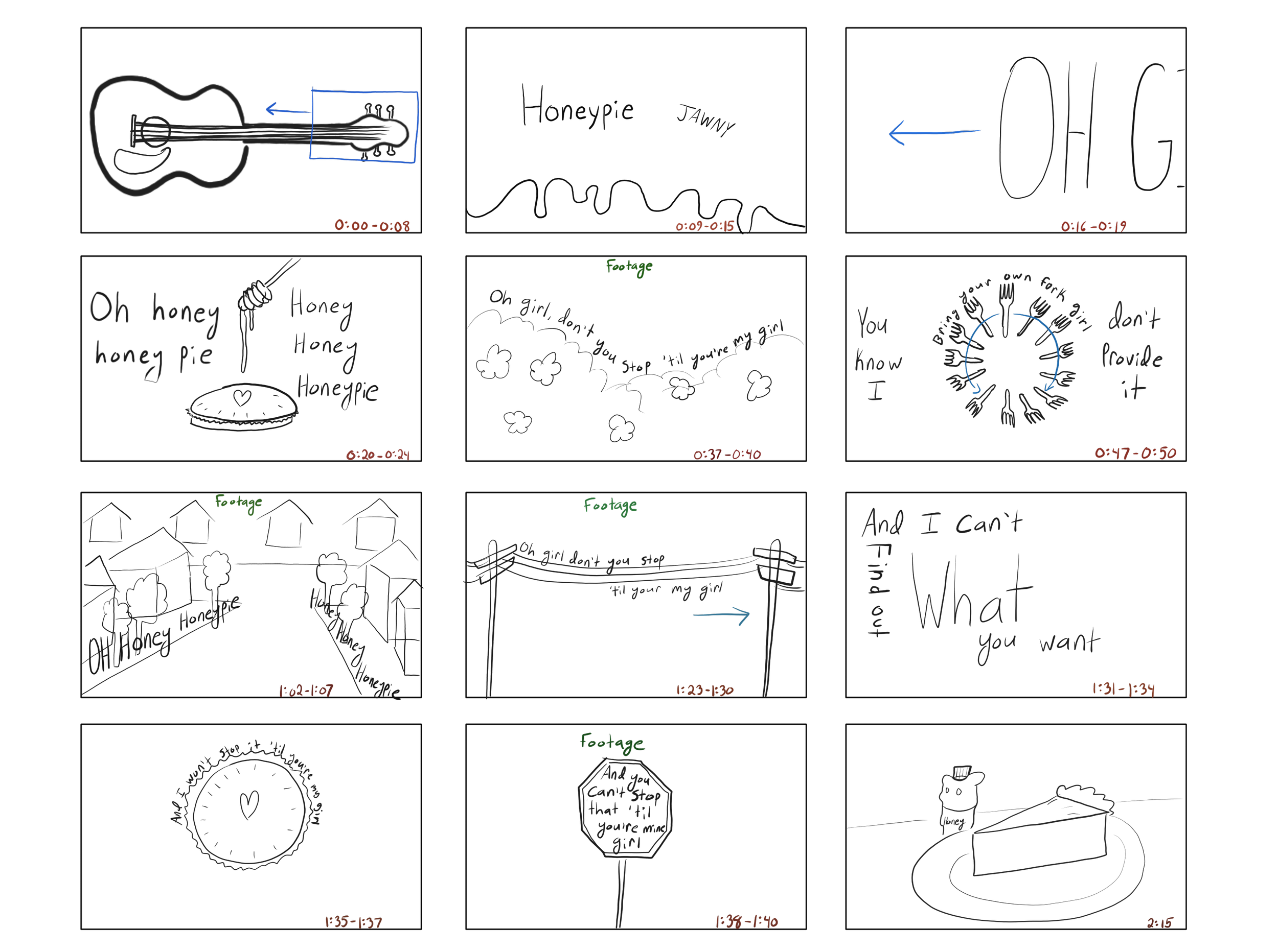 The assignment to create a rhythmic video with 3D camera tracking inspired me to do a full song lyric video to the song Honeypie by JAWNY. The album had an existing nature aesthetic, so I wanted to keep that so the lyric video could accompany the existing content of the song itself.